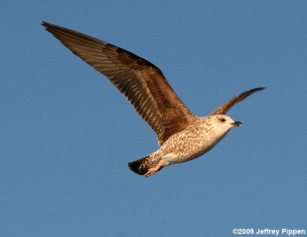 Lesser Black-backed Gull (Larus fuscus) Cape Hatteras, Dare Co., NC 21 Feb 2009 Immatures show fairly pale mottled underparts and a whitish head contrasting with dark brown wings & back and a broad black tail tip band. |
