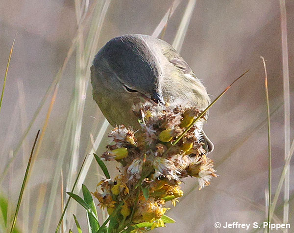 Orange-crowned Warblers (Oreothlypis celata) Pea Island NWR, Dare Co., NC 18 Oct 2025 Foraging in goldenrod flower/fruit clusters |