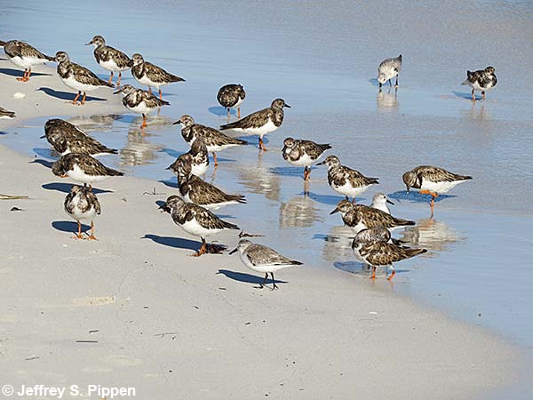 Sanderlings (Calidris alba) and Ruddy Turnstones (Arenaria interpres) Bahia Honda State Park, Monroe Co., FL 11 Feb 2015 Feeding in the rack line. |