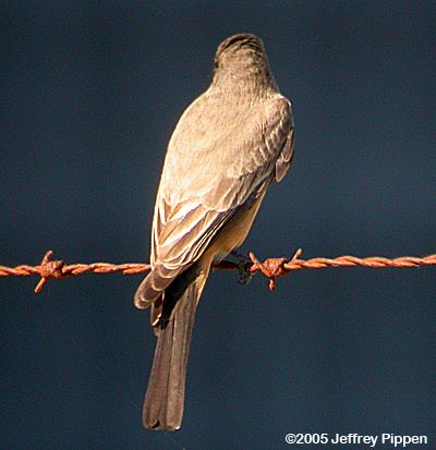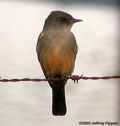 Found by Sam Cooper at Open Grounds Farm on 1 December 2005, this bird is about the 3rd NC record. Say's Phoebe is a bit larger than our Eastern Phoebe and has a slightly larger bill. Say's Phoebes are grayish brown above with a paler grayish throat & upper breast. The head, wings, and tail are darker than the back. The eye is dark and the bill is all dark. The belly and undertail coverts are an attractive shade of tawny/ochre. This bird was quite active and acrobatic in the air, chasing down bugs and swooping around, much more "fun" to watch than Eastern Phoebes! DigiscopedCarteet Co., NC 2 Dec 2005 |