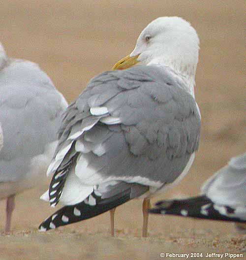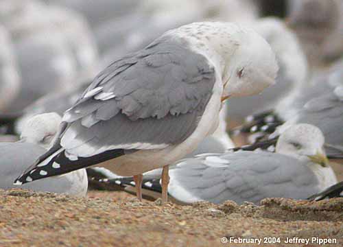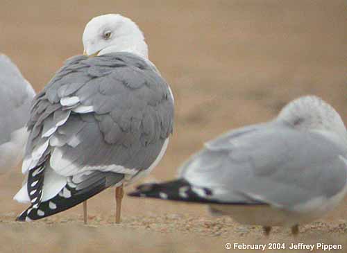This gull was observed by a bunch of birders on 15 Feb 2004 near Cape Hatteras Point on the "south beach" with a flock of mostly Herring Gulls. It was essentially the same size as, or perhaps very slightly larger than, nearby Herring Gulls. Any comments about this bird's identity are welcome! Various thoughts of this bird's identity include a Herring Gull hybrid, a "Yellow-legged" type Herring Gull from Europe, and a Yellow-legged Gull. Unfortunately, I didn't get any good full bill or spread-wing photos. These photos were "digiscoped" by hand-holding a Nikon CoolPix 4500 camera to a Kowa TSN-824 scope. This was an adult bird with a white head, a little bit of neck streaking, and an all white tail. The mantle color was clearly a couple shades darker than nearby Herring Gulls but also significantly lighter than nearby Lesser Black-backed Gulls. |
