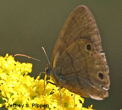 Carolina Satyr (Hermeuptychia sosybius) Duke Forest Durham Division, Orange Co., NC 23 Sep 2025 It's rare to see Carolina Satyrs nectaring, so I was fortunate to get photos of this individual nectaring on Pinewoods Goldenrond (Solidago pinatorum) |