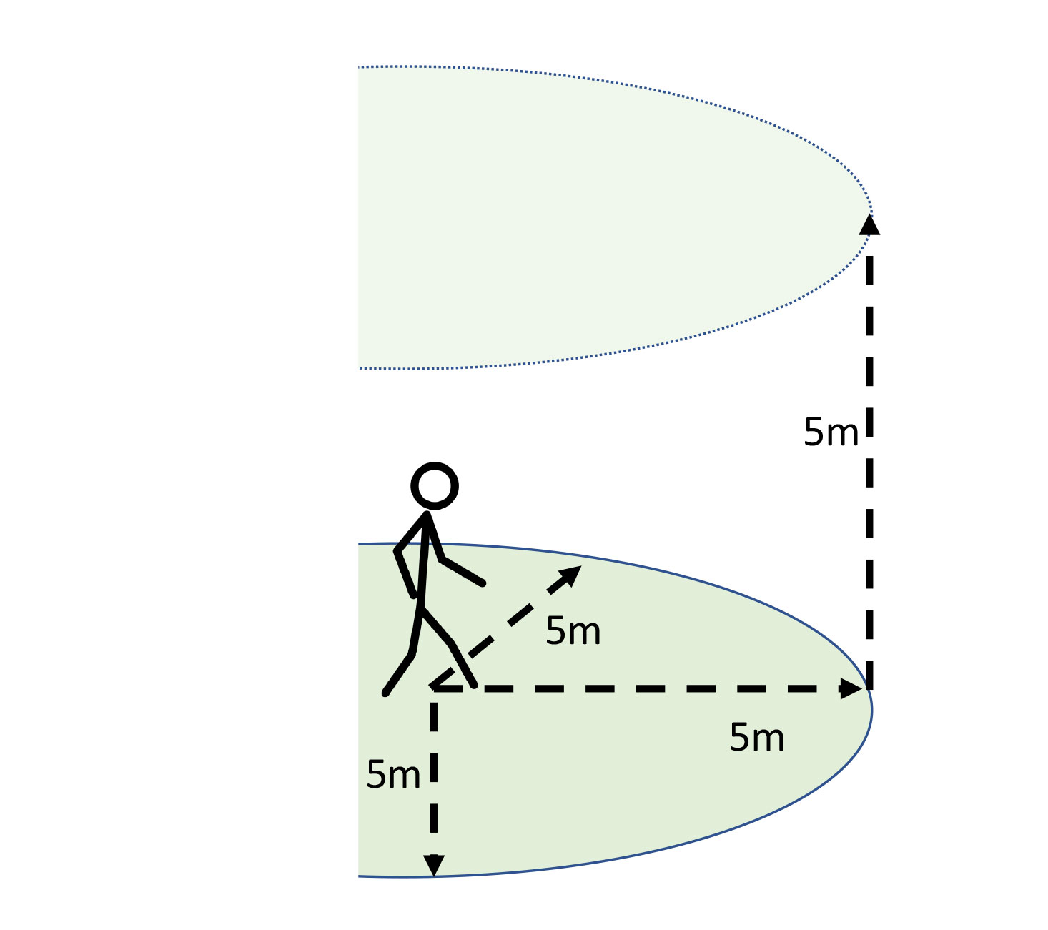 As you walk forward, imagine a 5-meter radius where you are in the middle of a circle (or bottom-center of a cylinder).