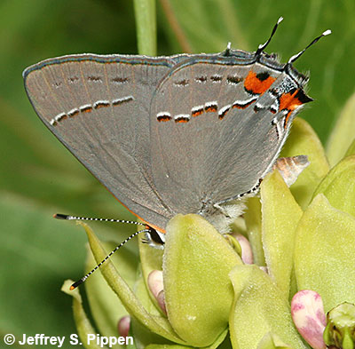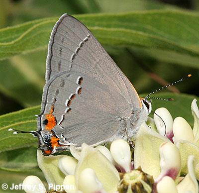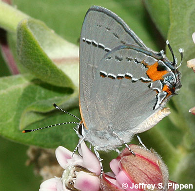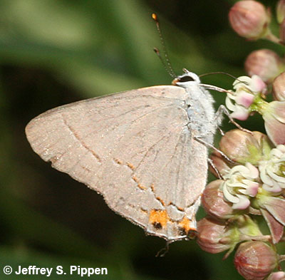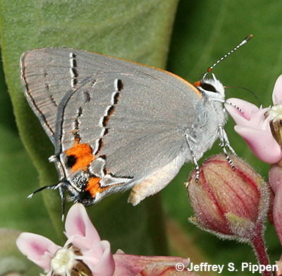 Gray Hairstreak (Strymon melinus humuli) nectaring on Butterfly Weed (Asclepias tuberosa) Moore Co., NC10 June 2006 |