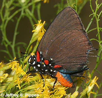 Great Purple Hairstreak (Atlides halesus) crawling on Flattop Goldenrod (Euthamia caroliniana) Scotland Co., NC 1 Oct 2006 |
