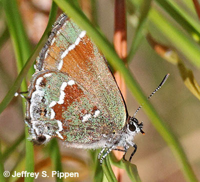 Juniper Hairstreak (Callophrys gryneus) New Hanover Co., NC 14 May 2013 Coastal individuals in NC (such as this worn individual) feed on Southern Redcedar (Juniperus silicicola) as caterpillars. |