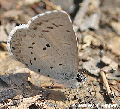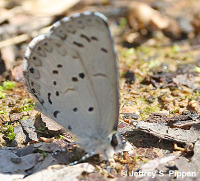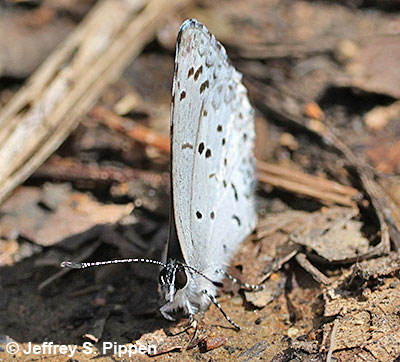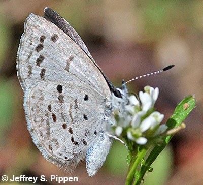 Summer Azure (Celastrina neglecta) Orange Co, NC 29 Mar 05 Spring brood of Summer Azure. Note the whitish underside with bold black spots and very white hindwing margin. |
