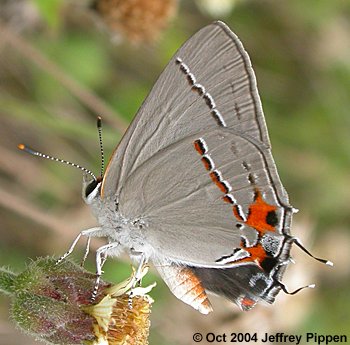 This worn Gray Hairstreak had a narrow miss with a bird or some other predator! Mission, Hidalgo Co., TX 13 Oct 2004 |