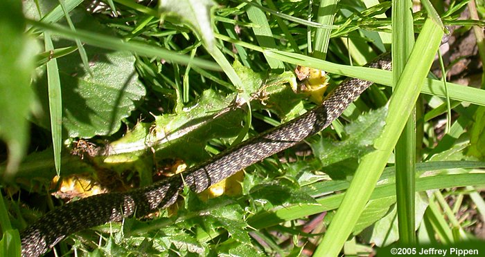Likely a young Western Garter Snake. You can barely see part of its head poking out from under a leaf in the upper right part of the picture. Big Springs Hollow, Utah Co., UT 18 June 2005 |