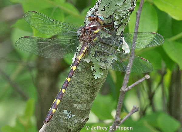 Brown Spiketail (Cordulegaster bilineata) Clay Co., NC 13 May 2006 Differentiated by the similar Twin-spotted Spiketail in that Brown Spiketails average smaller in size and the paired abdomen spots are generally all similar sized (Twin-spotted's spots vary). |
