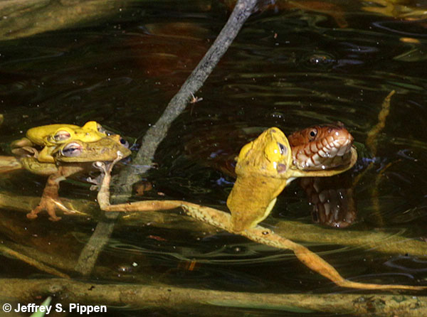 Cuban Tree Frog (Osteopilus septentrionalis) Fakatchee Boardwalk, Collier Co., FL 15 May 2018 Apparently this water snake has already had enough to eat...or else Cuban Tree Frogs aren't very tasty due to the toxic slime they produce... |