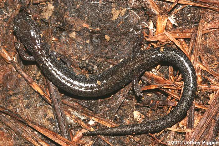 Red-backed Salamander (Plethodon cinereus) Under cover board in mixed pine/hardwoods in Duke Forest Durham Co., NC 11 Mar 2012 Some individuals show a strong reddish stripe down the back. |