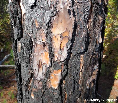 Slash Pine (Pinus elliottii) Planted in Duke Forest, Orange Co., NC 8 Sep 2012 Portions of outer bark often flake off, revealing reddish-orange patches. |