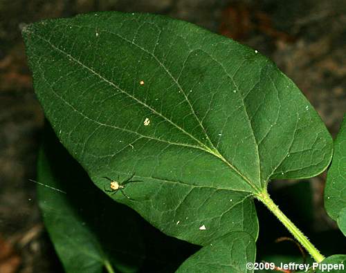 Mangora maculata orbweaver spider New Hope Creek bottomland in Durham Co., NC 6 Sep 2009 Note the spider on the lower left edge of the leaf. |