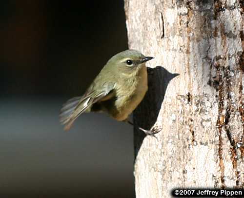 Female Black-throated Blues look very different from males. They're mostly olive with a short whitish eyebrow and square whitish mark along the edge of the folded wing. Durham, NC10 Feb 2007 |