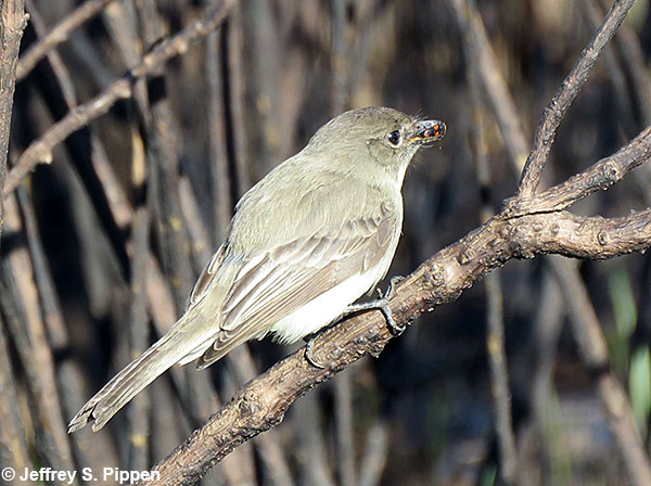 Eastern Phoebe (Sayornis phoebe) Anahuac NWR, Chambers Co., TX 14 Jan 2018 With a red and black bug in his/her bill. |