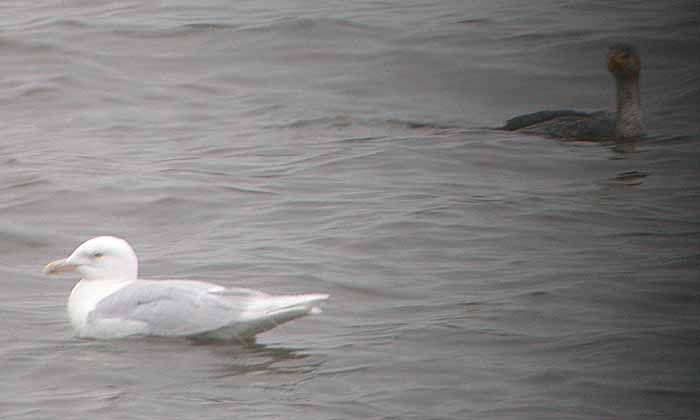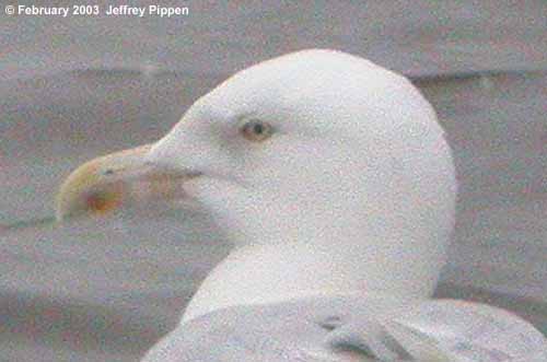 I've now received numerous comments about this gull and the general consensus (though not unanimous) is that this is a Glaucous Gull (Larus hyperboreus). Identifying Glaucous from Iceland Gulls (Larus glaucoides) can be problematic, but here are a few things to look for: Glaucous has a flatter head, "meaner" look, and a thicker and more substantial bill. Note that males are larger yet with blockier heads and longer bills, so this bird is likely a female Glaucous. |