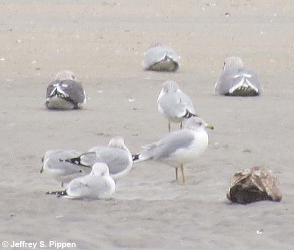 The mystery bird is near the far right. At the far left and middle left are two Lesser Black-backed Gulls, clearly darker than the mystery gull. The smaller, light gray gulls are Ring-billeds. Wrightsville Beach, New Hanover Co., NC |