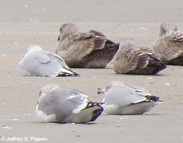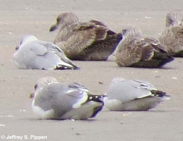 The mystery bird is the left bird. The sitting bird on the right is an adult Herring Gull. Ring-billed Gulls are in front. Wrightsville Beach, New Hanover Co., NC |