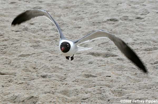 Laughing Gull (Larus atricilla) Ft. Fisher in New Hanover Co., NC 18 May 2008 In summer breeding plumage, Lauging Gull heads are all black. White crescents are found above & below their eyes, and bills are deep blood red. |