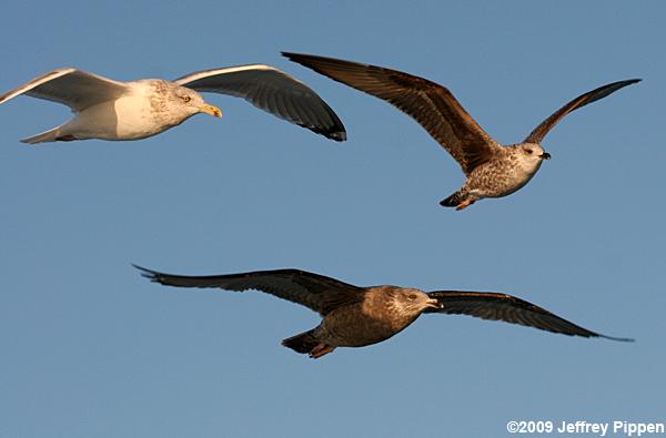 Lesser Black-backed Gull (Larus fuscus) Cape Hatteras, Dare Co., NC 21 Feb 2009 Compared to Herring Gulls (adult left and immature bottom), Lesser Black-backed Gulls (upper right) are a bit smaller with a slimmer build and relatively long narrow wings. |