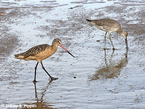Marbled Godwit (Limosa fedoa) Pea Island NWR, Dare Co., NC 10 Oct 2019 with a Willet (right) |