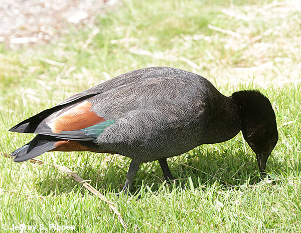 Paradise Shelduck (Tadorna variegata) Rob Roy Glacier Hike, Mt. Aspiring NP, Queenstown-Lakes District County, Otago, New Zealand 10 Dec 2018 Females are rufous with white heads. Males are dark gray with green and rufous patches in good light. |