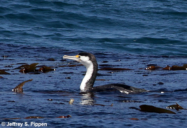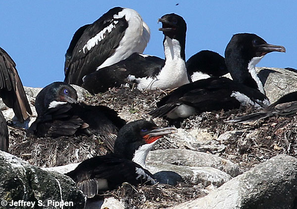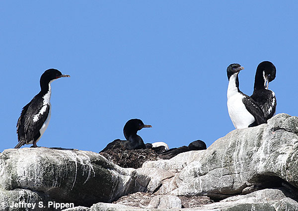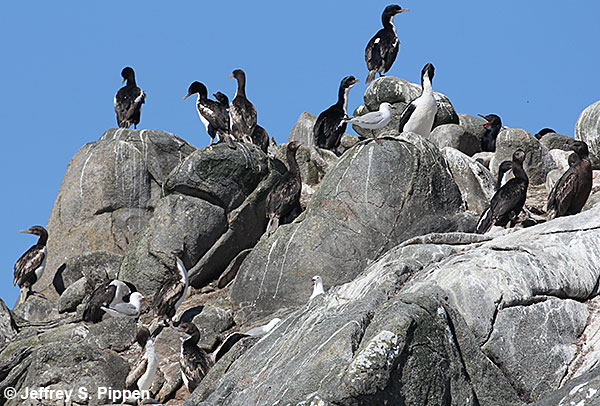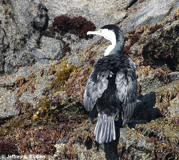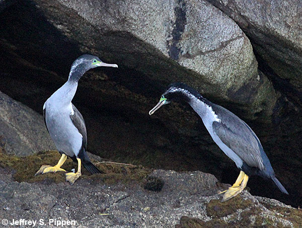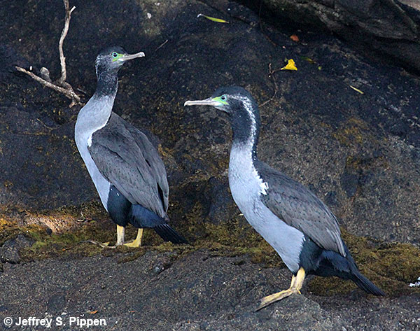 Stewart Island Shag, Stewart Shag, Bronze Shag (Phalacrocorax chalconotus, Leucocarbo chalconotus) Stewart Island, Southland District Co., Southland, New Zealand 14 Dec 2018 This species has been treated taxonomically differently by several authorities. It's found in two color morphs, all dark (Bronze), and white bellied. As you can see, both color morphs occur together. |