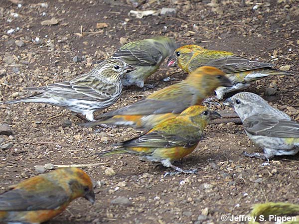 Red Crossbill (Loxia curvirostra) Idaho Co., ID 20 Apr 2014 A Cassin's Finch tries to blend in with the crossbills. |