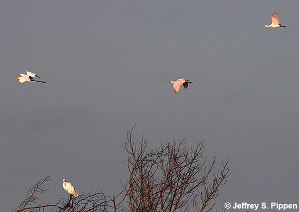 Roseate Spoonbills (Platalea ajaja) Ten Thousand Islands, NWR, Collier Co., FL 18 May 2018 Flying with Great Egrets |