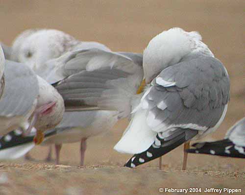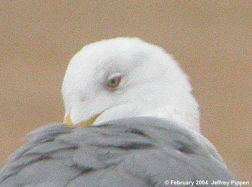 This gull was observed by a bunch of birders on 15 Feb 2004 near Cape Hatteras Point on the "south beach" with a flock of mostly Herring Gulls. It was essentially the same size as, or perhaps very slightly larger than, nearby Herring Gulls. Any comments about this bird's identity are welcome! Various thoughts of this bird's identity include a Herring Gull hybrid, a "Yellow-legged" type Herring Gull from Europe, and a Yellow-legged Gull. Unfortunately, I didn't get any good full bill or spread-wing photos. These photos were "digiscoped" by hand-holding a Nikon CoolPix 4500 camera to a Kowa TSN-824 scope. This was an adult bird with a white head, a little bit of neck streaking, and an all white tail. The mantle color was clearly a couple shades darker than nearby Herring Gulls but also significantly lighter than nearby Lesser Black-backed Gulls. |