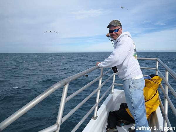 Yellow-nosed Albatross (Thalassarche chlororhynchos) Cape Hatteras offshore, Dare Co., NC 22 Feb 2014 Captain Brian Patteson points to the albatross from the bow of the Stormy Petrel II. Many thanks to Kate Sutherland and Brian Patteson for conducting top notch seabirding opportunities off North Carolina! |