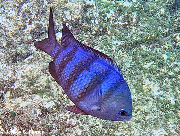 Atlantic Sergeant Major (Abudefduf saxatilis) Fernando de Noronha, Brazil 8 Aug 2025 Adult males can become quite blue. GoPro video screenshot |