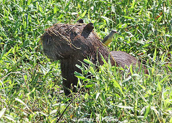 Capybara (Hydrochoerus hydrochaeris) Porto Jofre, Mato Grosso, Brazil 30 July 2025 This individual emerged from the marsh with his camouflage and a Cattle Tyrant standing guard. |