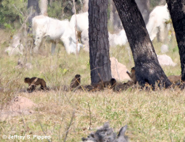 Azara's Capuchin (Sapajus cay) Pousada Piuval, Mato de Grosso, Brazil 28 July 2025 Distant troop under the trees |