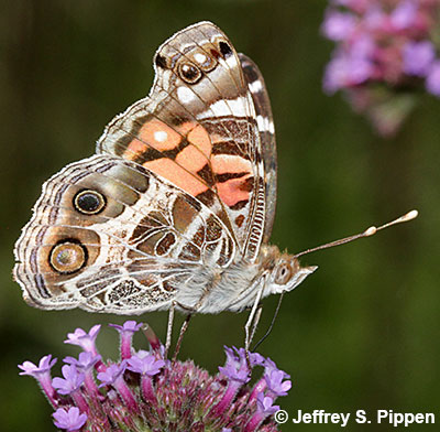 | Nectaring on Verbena Pettigrew State Park, NC 21 June 2003. One of approximately 500 American Ladies that day! |