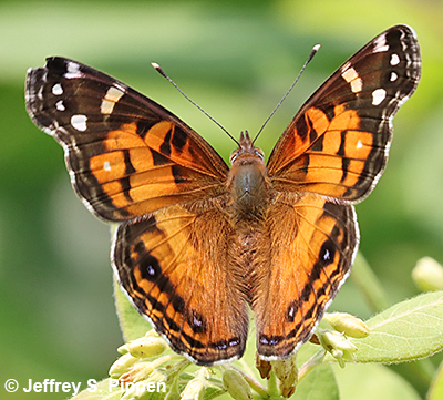 Similar to the Painted Lady but note the more squared off forewing tip, the white spot in the red-orange area of the forewing, and the 2 large (rather than 4 medium) eyespots on the ventral hindwing. American Ladies are common statewide in NC and may be found from spring into the fall.