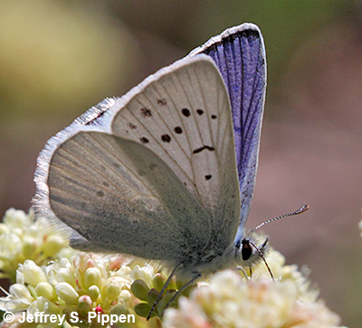 Males are bright blue above with black veins. In many populations, the underhindwings are nearly white with very faded spots, contrasting sharply with the bold spots in the underforewing. |