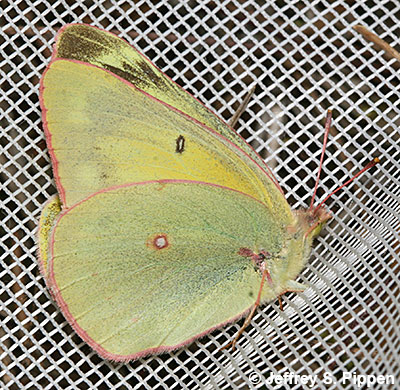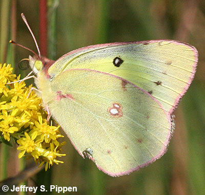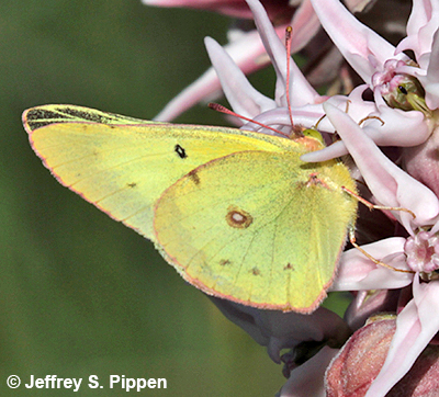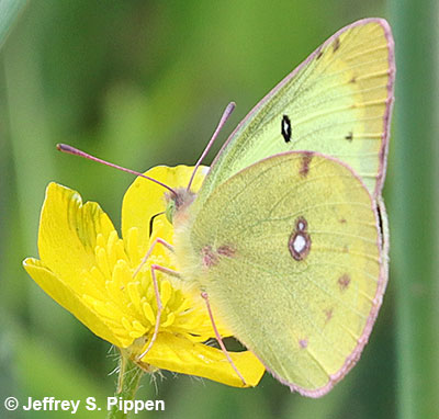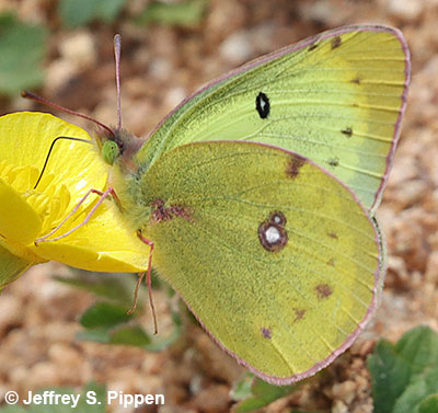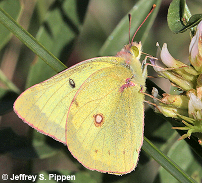 Clouded Sulphur (Colias philodice eriphyle) Near Condon, Missoula Co., MT 4 Aug 2014 Note that looking at the ventral might give you the impression of Orange Sulpbur, but the dorsal clearly shows no orange in the forewing. |
