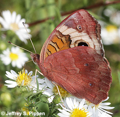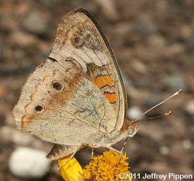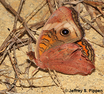 Common Buckeye (Junonia coenia form rosa) Many autumn individual ("dry season") Common Buckeyes show rich brick red (often described as rose-red) under hindwings. |
