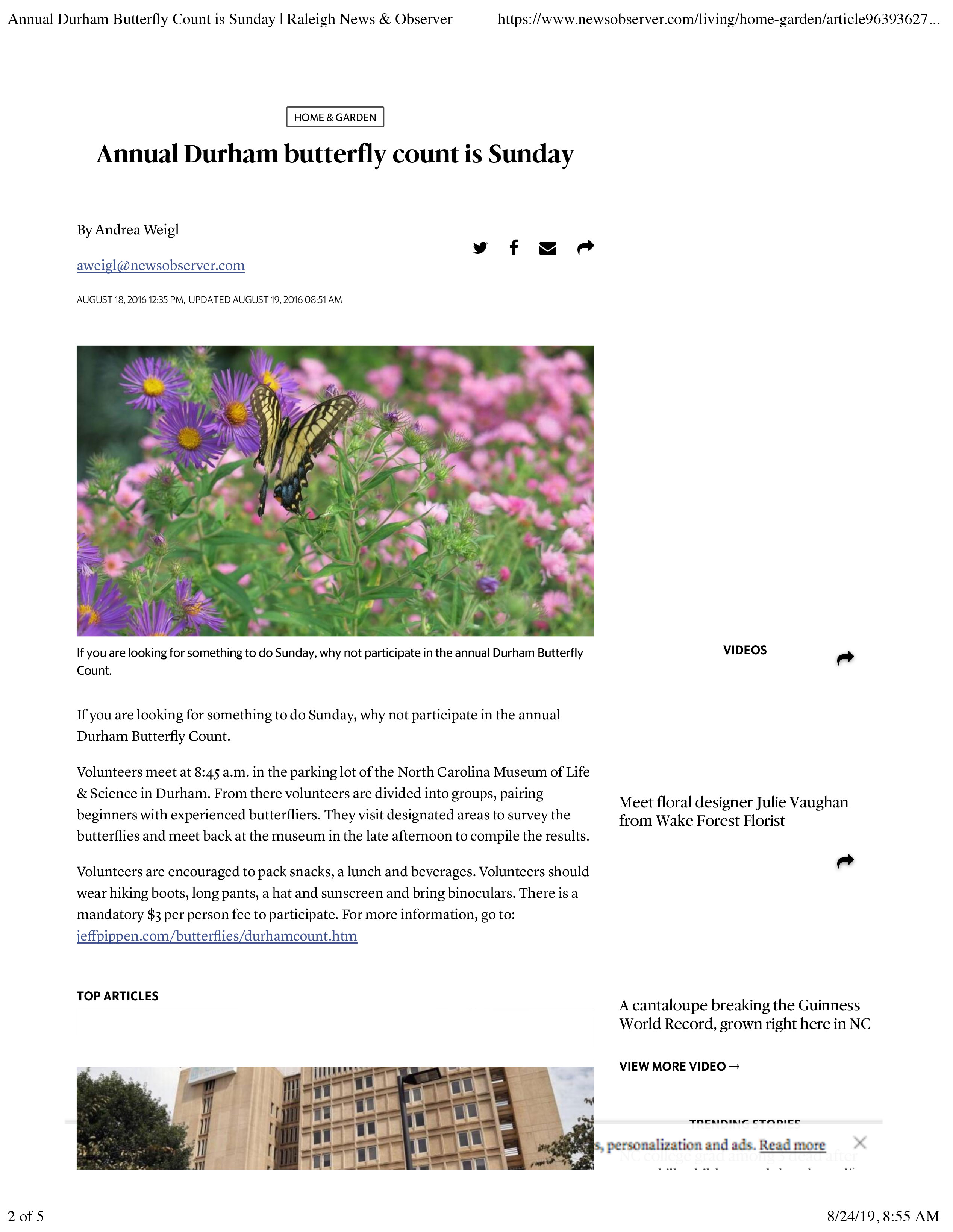 Welcome to the Durham Butterfly Count information page. This survey is part of the North American Butterfly Association's (NABA) "Fourth of July" or Seasonal Butterfly Count program. The Durham Count was established in 1999 and has been conducted annually except in 2004 and 2012 when it was weathered out by tropical rain systems! Many other butterfly surveys take place across North Carolina. For a list of other surveys and schedules, consult the Carolina Butterfly Society website.