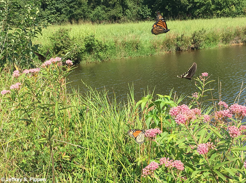 At least one Eastern Tiger Swallowtail, two Spicebush Swallowtails, and two Monarchs are in the photo enjoying Swamp Milkweeds. 18 Aug 2019 |