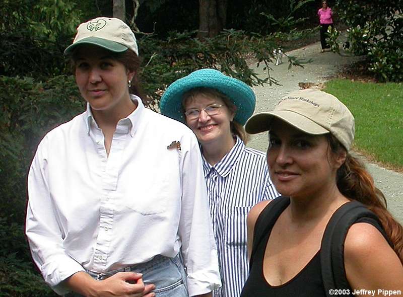 Laura hosts a Common Buckeye on her shoulder while Bonnie's hat provides a nice perch for a Silver-spotted Skipper as Lou looks on. August, 2003 |