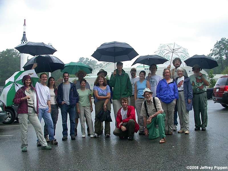 We may have set a new record in 2008 for the most umbrellas needed at the beginning of a butterfly count! Fortunately, the rain moved on out and we persisted and ended up tallying a remarkable 59 species and over 3000 individual buttterflies today! From left to right: Jennifer, Will, Freddie-Jeanne, Ted, Dave, Marty, Wendy, Tom, Owen, Carl (front), Harry (back), Allison, Bob (front), Clinton, Meg, Randy, Nancy, Jim. 10 August 2008 |