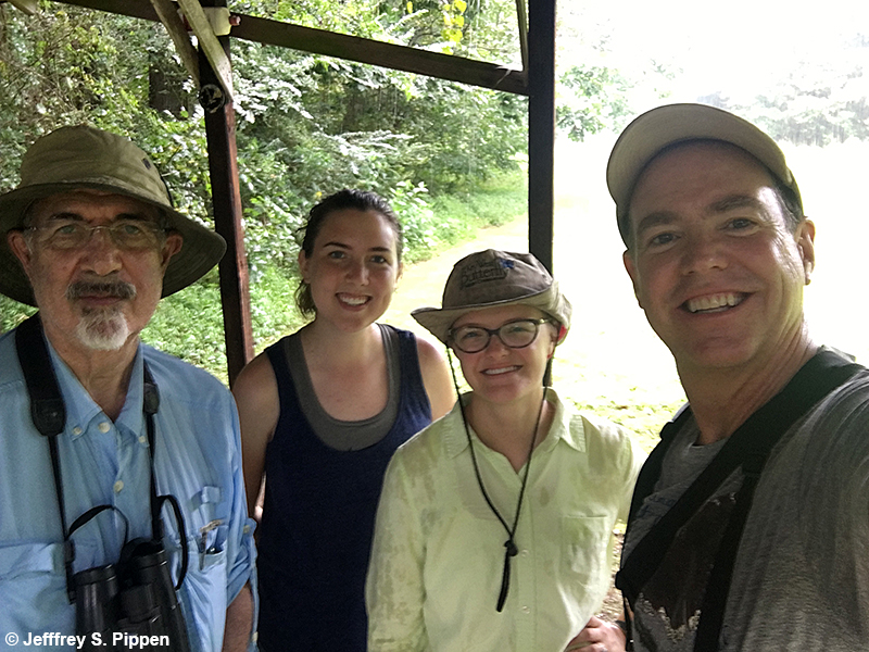 Tom, Laura, Kati, and Jeff wait out a passing shower under a shelter in the woods. Satyrs and others resumed flying as rain died down, and some even flew during the rain! 21 Aug 2016 |