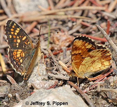 #9830 Female California Crescent over male Field Crescent. Eagle Meadows west of Sonora Pass, Tuolumne Co., CA 11 July 2007 |