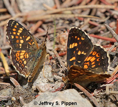 #9835 Female California Crescent over male Field Crescent. Fence Creek Rd west of Sonora Pass, Tuolumne Co., CA 11 July 2007 |