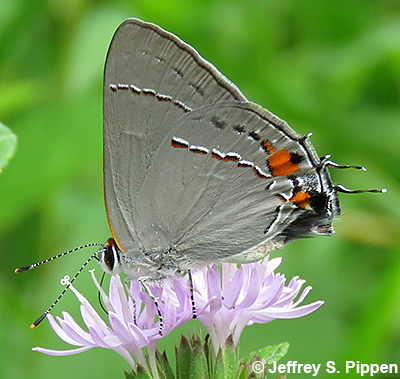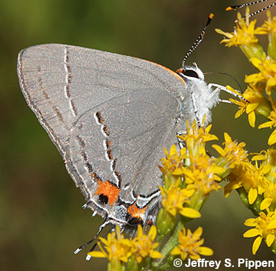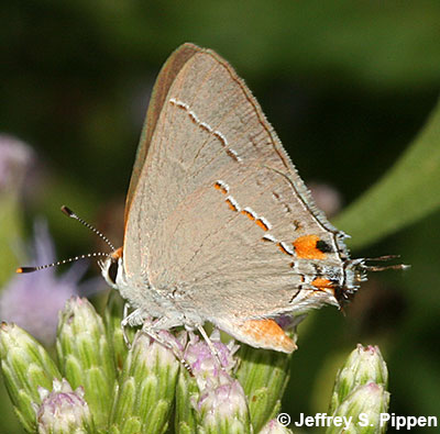 Gray Hairstreak (Strymon melinus humuli) nectaring on Butterfly Weed (Asclepias tuberosa) Moore Co., NC10 June 2006 |