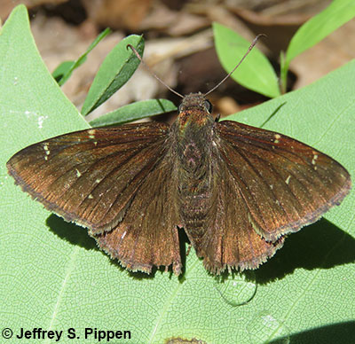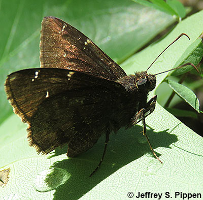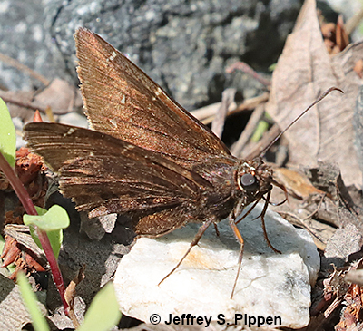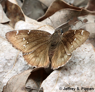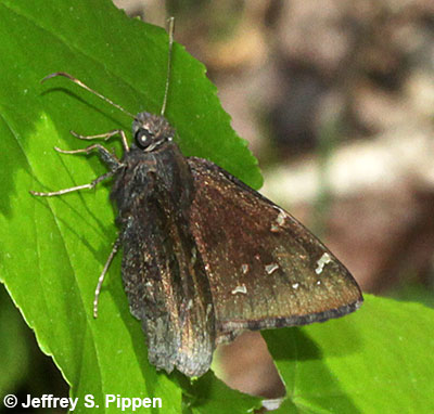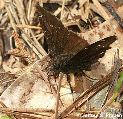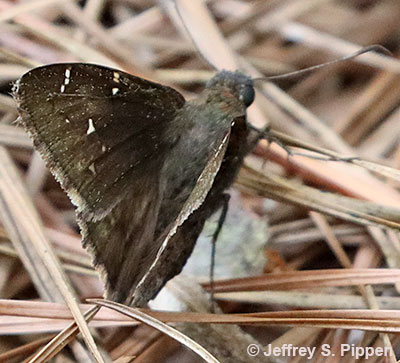 Northern Cloudywing (Thorybes pylades) Alamance Co., NC 6 June 2004 The white spots are somewhat bolder than usual on this individual but note overall very dark brown, dark fringes, and offset lowermost spot (of the apical spot line). |