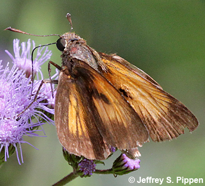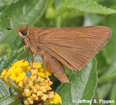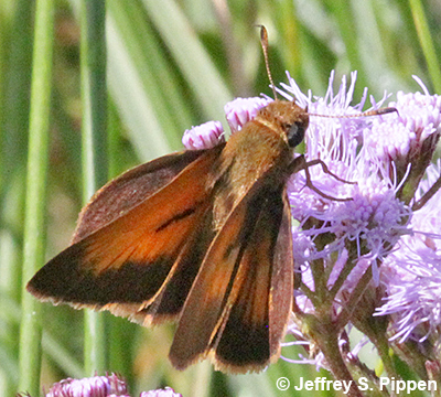 Palakta Skippers are large and are mostly unmarked below with the costal margin of the underforewing being contrastingly lighter tawny-orange. They are frequently described as looking like a giant Tawny-edged Skipper. They are nectar generalists feeding on many species of flowers, exemplified by the photos below on Solidago, Agalinis, and two species of Eupatorium.
